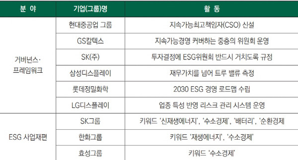 전국경제인연합회는 5일 이 같은 내용을 담은 ‘K기업 ESG(환경·사회·지배구조) 백서’를 발간했다. 30대그룹과 전경련이 운영하는 K-ESG 얼라이언스 회원사의 지속가능보고서, 실태조사 등을 토대로 작성됐다.