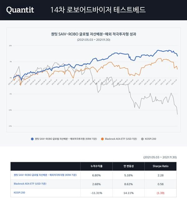퀀팃은 '퀀팃 SAIV-ROBO 글로벌 자산배분 - 해외' 알고리즘으로 최근 샤프지수(Sharpe Ratio) 2.28, 누적 수익률 6.8%를 기록(2021.5.3~11.30)하며, 적격 심사를 통과했다. 샤프지수는 펀드 성과를 평가하는 대표 지표로, 샤프지수가 높을수록 변동성 대비 운용성과가 좋은 것으로 평가된다.