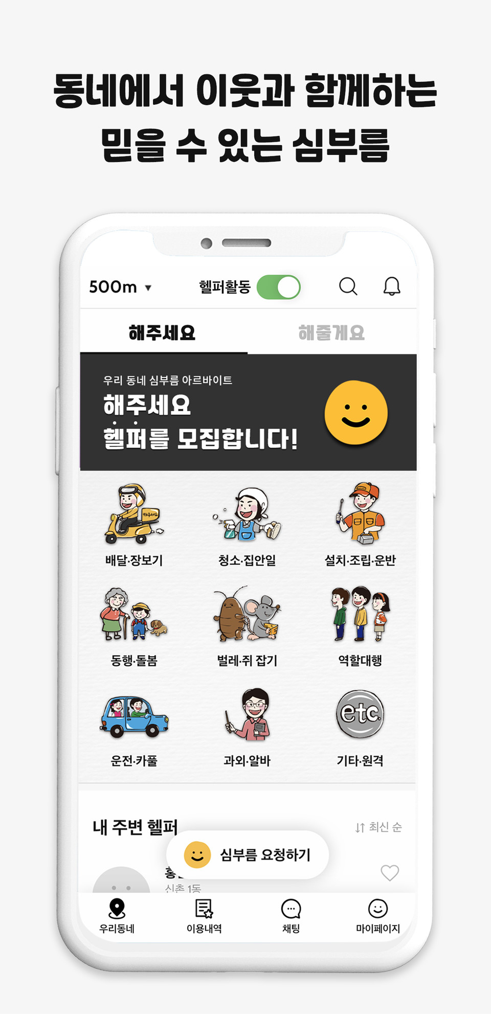해주세요는 사용자 인근을 중심으로 애플리케이션 카테고리 내에서 누구나 배달·장보기, 설치·조립·운반, 청소·집안일, 돌봄, 과외·알바 등의 심부름을 요청할 수 있고, 동시에 헬퍼가 될 수 있다.