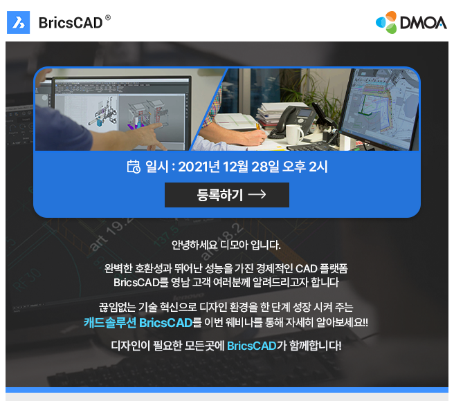 [테크월드뉴스=조명의 기자] 브릭시스의 ‘브릭스캐드(BricsCAD)’ 국내 총판 디모아는 오는 12월 28일 온라인 세미나를 진행한다고 밝혔다.