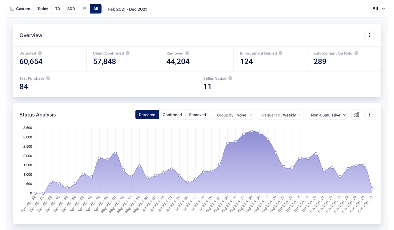 기존 마크커머스 플랫폼은 제거가 완료된 위조상품 데이터 분석만 가능했으나, 이제는 탐지, 신고, 제거된 제품의 데이터를 각각 분류해 제공하는 것은 물론, 데이터의 사용 목적 따라 분석 기간·조건을 자유롭게 설정하는 커스텀 대시보드 기능도 함께 지원한다.