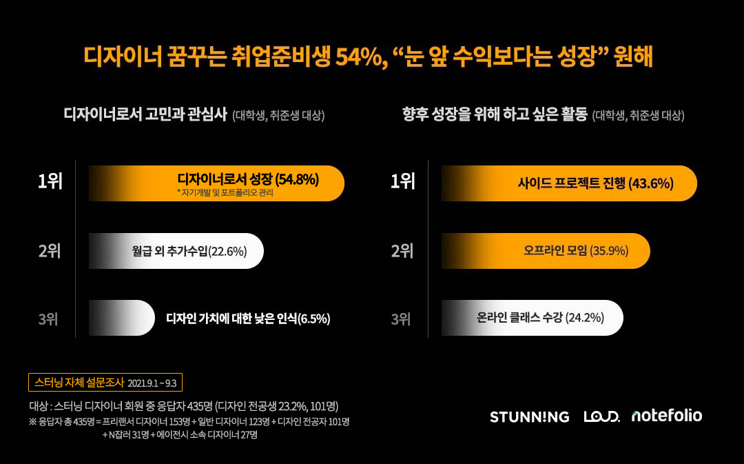 이 중 학생·취업준비생(디자인 전공자)은 디자이너로서의 성장에 가장 큰 관심을 보이는 것이 특징이다. 디자이너로서의 고민과 관심사를 묻는 항목에서 학생·취준생은 54.8%가 자기 계발과 포트폴리오 관리라고 답했다. 이는 추가적 수입처 발굴을 원한다는 응답(22.6%)보다, 아울러 타 직군 대비해서도 2배 가량 높은 수치(프리랜서 25%, N잡러 29.7%, 톱디자이너 23%)다.