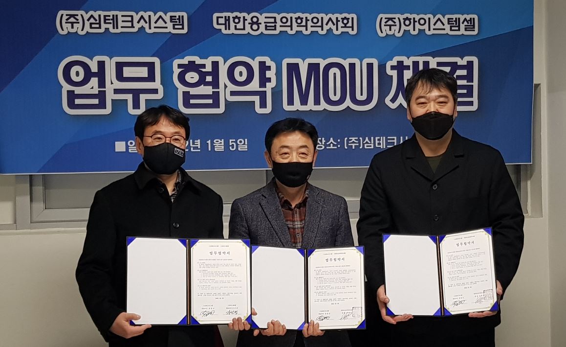 심테크시스템 본사에서 지난 1월 5일 진행된 체결식에는 정영교 대표를 비롯해 대한응급의학의사회 이형민 회장, 하이스템셀 김선만 대표가 참석했다.