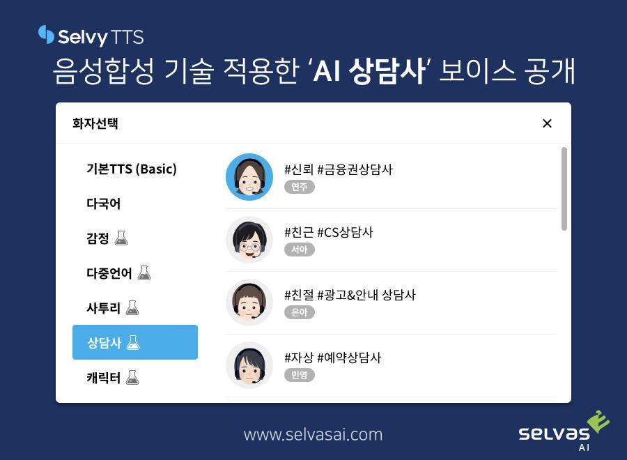 [테크월드뉴스=조명의 기자] 셀바스 AI가 AI음성합성 기술을 적용한 ‘AI 상담사’ 보이스를 공개했다고 밝혔다.