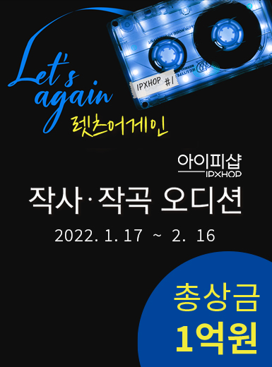 [테크월드뉴스=박응서 기자] 국내 최초 종합 IP투자 플랫폼 아이피샵(IPXHOP)이 총상금 1억원의 작사ㆍ작곡 오디션인 ‘렛츠어게인’(Let’s again)을 실시한다.