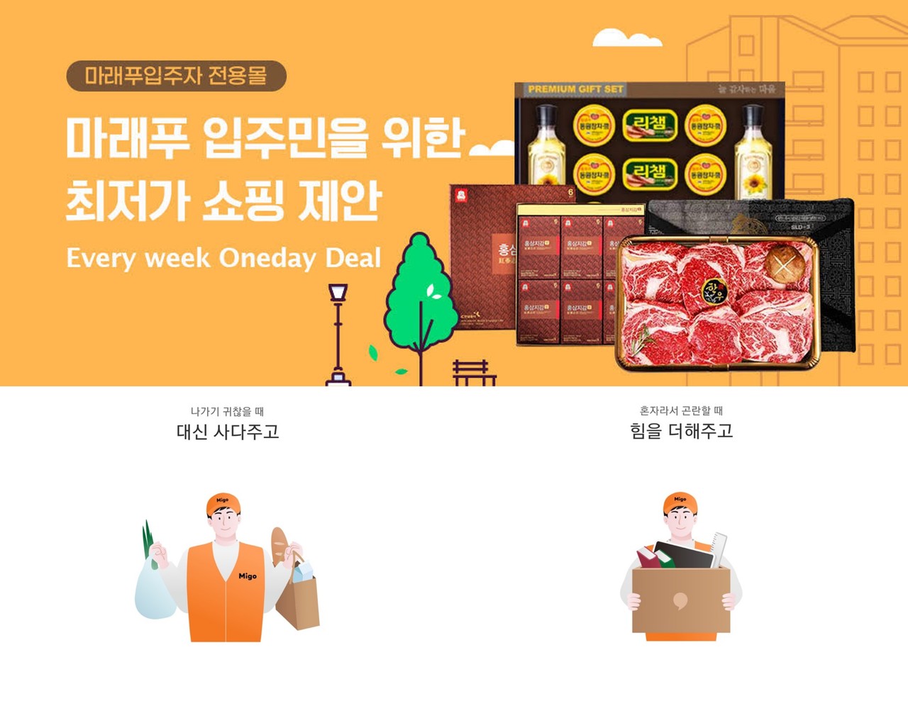 미고와 셀러드는 마포래미안푸르지오(마래푸) 입주민에게 설 선물세트, 식료품, 주방용품을 최대 90% 할인하는 ‘미고 에브리위크 원데이 딜’ 행사를 2월 말까지 진행한다. 미고와 셀러드는 매주 설 선물과 정육·청과, 생활용품, 건강기능식품 중 다양한 특가상품을 선정해 시중가의 10분의 1이라는 파격적인 가격에 할인 판매한다.