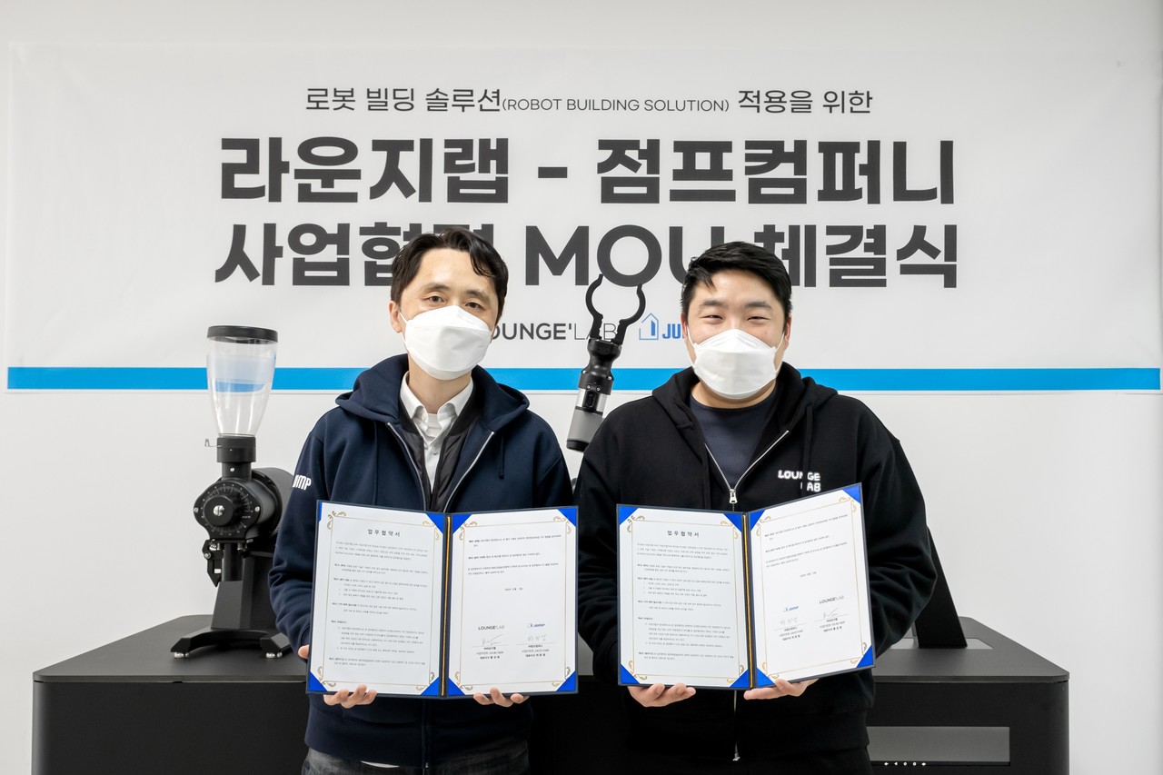 양사는 이번 협약을 통해 서비스 자동화 기술 적용에 최적화된 로봇 친화적 빌딩 솔루션을 개발하기 위해 전면적 협력을 추진한다. 지난 1월 14일 성동구 라운지랩 사무실에서 진행된 협약식에는 황성재 라운지랩 대표와 박희영 점프컴퍼니 대표를 비롯해 양사 주요 관계자가 참석했다.