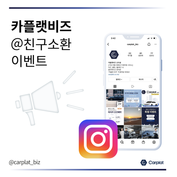 카플랫 비즈는 기업과 임직원들이 업무용 차량을 공유하던 방식의 기존 서비스를 오피스 건물 단위의 커뮤니티로 확장시키는 신개념 서비스로, 빌딩 커뮤니티 차량 공유 서비스를 친구에게 소개하는 인스타그램 댓글 이벤트를 진행한다.