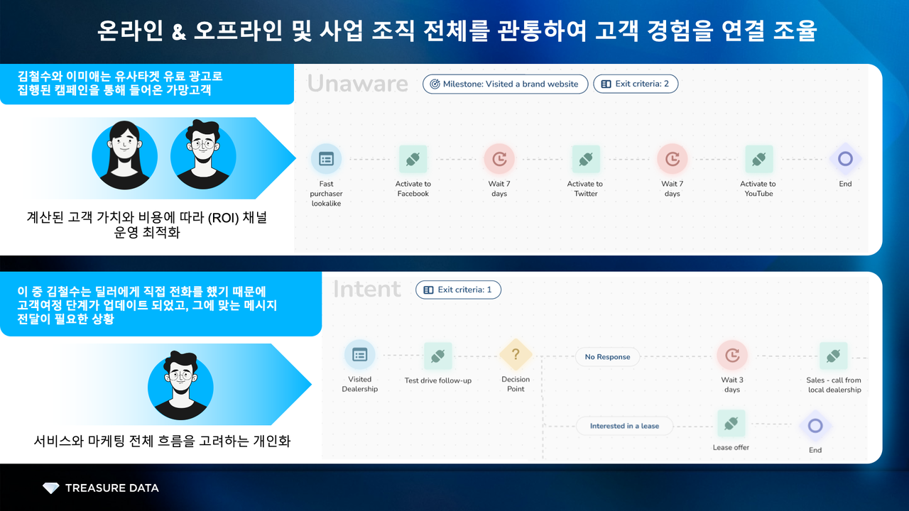 트레저데이터 고객 여정 오케스트레이션은 기업 내의 다양한 사업부서와 브랜드 간에 유기적으로 협업할 수 있는 방법을 AI 기반의 고객 프로필 데이터와 인사이트를 제공한다. 드래그앤드롭 방식의 시각화 도구를 사용해 마케터는 개별 고객 여정이 브랜드 인지에서 구매, 브랜드 충성도 등으로 발전함에 따라 모니터링하고, 그에 따른 초개인화된 여정을 계획하고 실행하며 최적화할 수 있다. 사실상 무제한의 확장성이라고 볼 수 있는 월 1000억 개 이상의 고객 프로필에 대해 마케팅 액션을 실행할 수 있는 기능과 기본으로 연동된다.