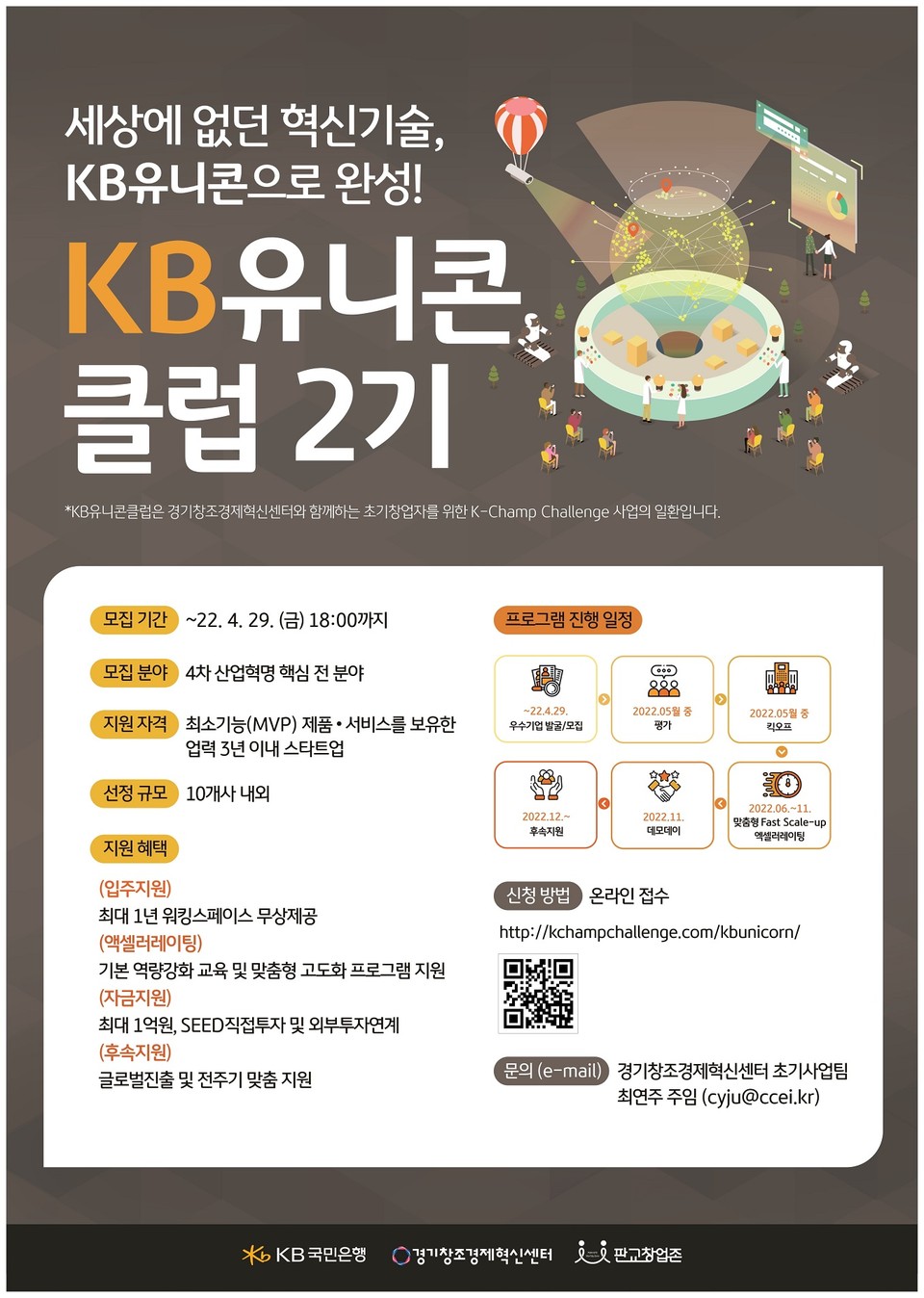 [테크월드뉴스=조명의 기자] 경기창조경제혁신센터(이하 경기혁신센터)가 오는 4월 29일까지 2022 K-챔프 챌린지(K-Champ Challenge) ‘KB유니콘클럽’ 2기 참가기업을 모집한다고 밝혔다.