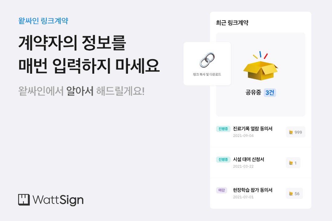 왙싸인 링크계약은 전자문서에 고유 URL을 부여, 불특정 다수에게 서명 요청을 할 수 있다. 수백, 수천이 되는 서명자의 정보를 일일히 입력할 필요 없이 URL 혹은 QR코드를 통해 전자서명 수집이 가능하고, 각종 문서 전달, 서명 요청이 한번에 이뤄져 업무 효율 향상은 물론, 완료된 문서의 보관·분류까지 수월해진다.