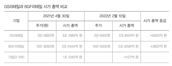반면 반사 이익을 본 편의점 CU를 운영하는 BGF리테일은 2021년 4월 30일 주가가 15만 3000원으로 시가 총액으로 2조 6444억 원이었다. GS리테일보다 1조 1045억 원이 낮았다. 그러나 2022년 2월 10일에 주가(종가 기준)가 16만 9500원으로 오르면서 시가 총액이 2조 9296억 원이 되면서 GS리테일을 시가 총액에서 1127억 원이나 앞섰다.