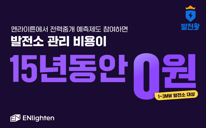 [테크월드뉴스=조명의 기자] 엔라이튼이 전력중개 발전량 예측제도에 참여한 발전사업자에게 최대 15년 동안 연 1000만 원 상당의 발전소 관리 서비스를 0원에 제공하는 등 다양한 혜택의 프로모션을 진행한다고 밝혔다.