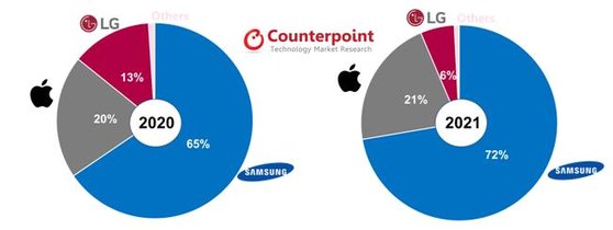 반면 2위 업체인 애플은 시장점유율이 재작년 20%에서 지난해 21%로 1%포인트 오르는 수준에 그쳤다.