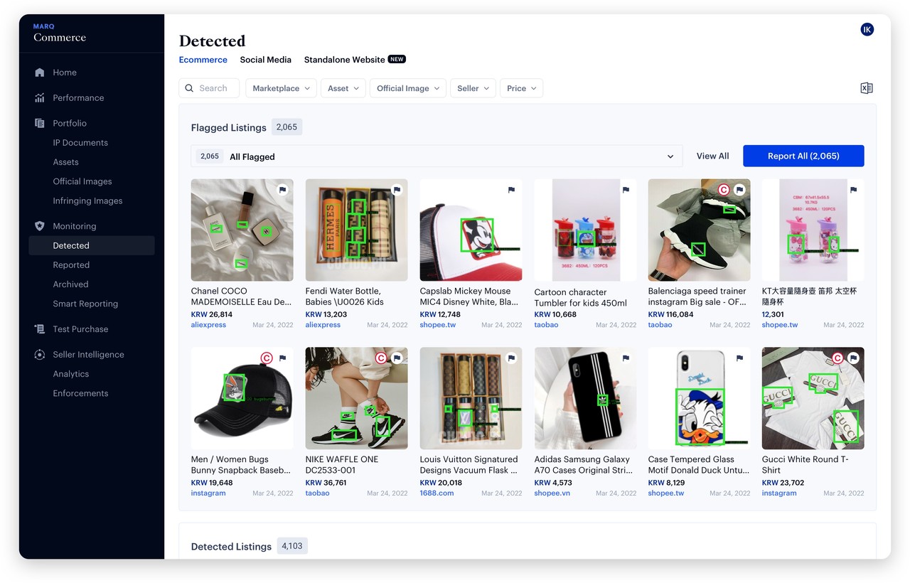 로고 디텍션은 수천만 건 이상의 브랜드 로고 데이터베이스 학습을 완료한 마크비전의 AI 알고리즘이 제품 이미지에 반영된 로고의 범위를 자동으로 파악해 위조상품들을 분석·분류하는 기능이다. 온라인 마켓플레이스 내 위조상품 탐지의 정확도를 향상시키는 것은 물론, 도용된 로고 이미지 영역을 자동으로 리포팅해 모니터링 신고 프로세스를 한층 더 간소화할 수 있도록 지원한다.