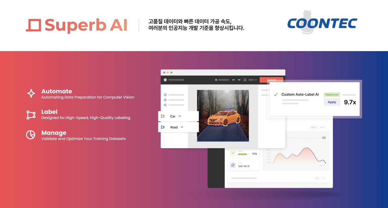 슈퍼브에이아이는 오토 라벨링 서비스를 제공해 수동 라벨링 대비 최대 95%까지 라벨링 시간을 단축할 수 있다. 슈퍼브에이아이는 AI가 1차로 데이터를 라벨링한 후 검수를 요청한 부분의 2차 수정을 진행해 데이터 처리 속도를 향상시킨 AI기반 데이터 구축 플랫폼 ‘슈퍼브에이아이 스위트(Superb AI Suite)’를 개발·공급하고 있다. 이를 통해 라벨링 소요 시간을 단축하고, 머신러닝 데이터 구축, 관리, 분석의 효율성을 극대화해 AI 모델 개발 과정에서의 협업 강화를 지원한다.