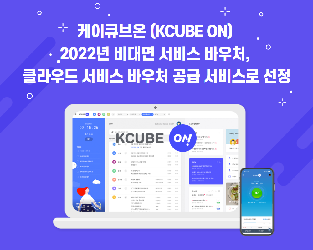 케이큐브온은 비대면 서비스 분야 중 재택근무(협업툴) 부문 공급 서비스로 선정돼 이달 말부터 올인원 업무 플랫폼 ‘케이큐브온’과 근태관리 서비스 ‘에잇아워(8HOUR)’를 K-비대면 바우처 플랫폼과 2022 클라우드 서비스 지원포털을 통해 제공할 예정이다.