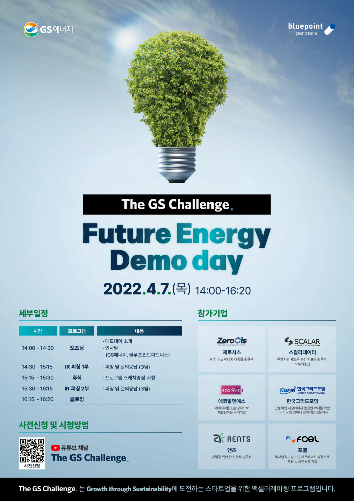 [테크월드뉴스=조명의 기자] 블루포인트파트너스가 GS에너지와 '더 지에스 챌린지 퓨처에너지(The GS Challenge. Future Energy)' 2기 데모데이를 오는 4월 7일 개최한다고 밝혔다.