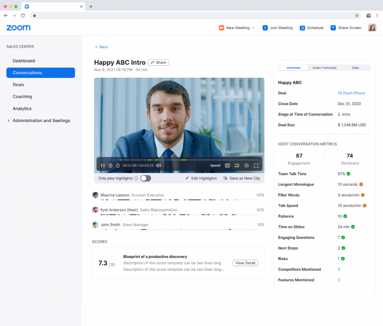 줌 IQ 포 세일즈는 줌 회의(Zoom Meetings)에서 사용할 수 있는 대화 인텔리전스 애드온이다. 이를 통해 마케팅, 영업, 경쟁 인텔리전스 팀 전반에서 고객과의 상호작용을 유의미하고 실용적인 통찰력으로 전환하고 고객과의 중요한 상호작용을 개선할 수 있다.