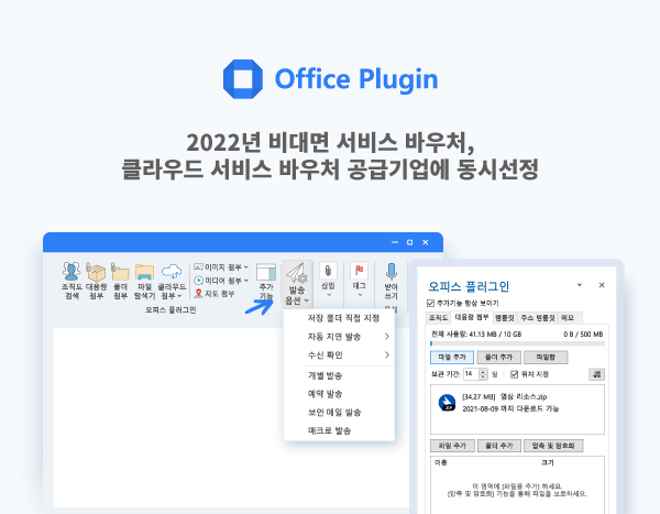 과학기술정보통신부가 진행하는 클라우드 서비스 바우처 사업은 전국 중소기업 업무 환경의 디지털 전환을 위해 클라우드 서비스 도입 컨설팅·전환 이용료를 지원한다. 사업 수요 기업으로 선정되면 오피스 플러그인의 이용 요금 80%를 지원받을 수 있다.