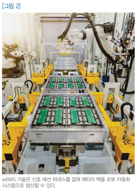모듈화하고 확장하기 쉬운 wBMS 시스템 플랫폼은 배터리 팩 조립 공정을 완벽하게 자동화할 수 있다. 신호 배선 하네스를 없앤 다음 배터리 모듈에 전원 단자를 연결하기만 하면 된다. 이 작업도 로봇을 활용해 자동화 공정으로 처리할 수 있다. 수작업이 필요 없어 OEM으로 활용하는 기업에서는 조립 라인 작업자들의 안전을 보장할 수 있다[그림2].