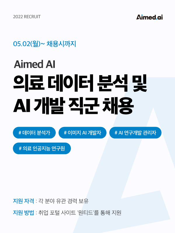 [테크월드뉴스=조명의 기자] 에임드AI가 의료 데이터 분석·AI 개발 직군 채용에 나선다고 밝혔다.