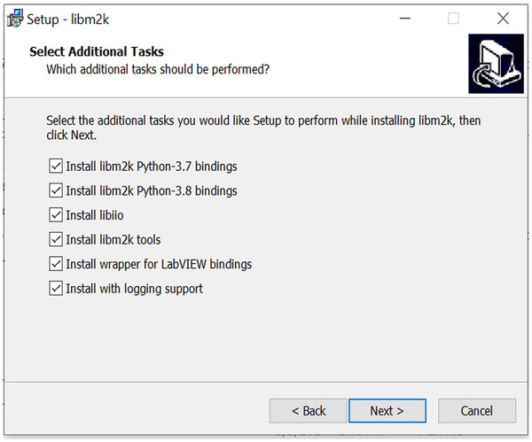 설치는 다음과 같이 한다. 먼저 아나로그디바이스 웹사이트에 들어가 최신버전(libm2k-0.4.0-Windows-Setup.exe)을 다운로드한다. 파일을 실행 후 추가 작업을 선택하라는 Setup 창이 뜨면 ‘Install libm2k Python bindings’를 선택한다.
