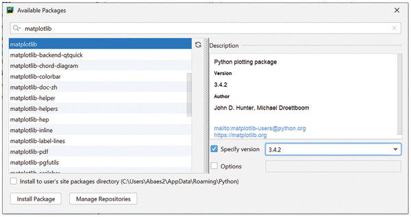 Available Packages 창이 활성화되면 검색창에서 matplotlib와 NumPy를 검색한다.