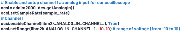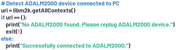 URI(uniform resource identifier)는 PC에 연결된 각 ADALM2000의 고유 식별자다. 이 코드 블록이 ADALM2000을 PC와 연결한다. PC에 연결된 ADALM2000 디바이스가 없으면 코드는 자동으로 종료된다.