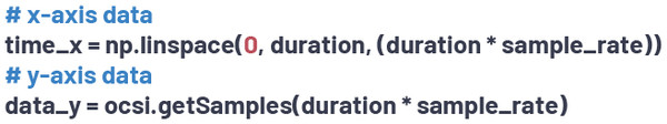 data_y는 ADALM2000 디바이스를 사용해서 포착한 파형 샘플들을 저장한다. 채널1의 샘플은 data_y[0]에 저장되고, 채널2의 샘플은 data_y[1]에 저장된다. 정확한 주파수로 파형을 표시하기 위해서 time_x에 사용된 것과 같은 샘플 수여야 한다.