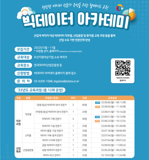 올해는 직무별(분석 전문가(정형,/비정형), 기획전문가, 기술전문가) ▲신직종 과정(데이터 거래·중개, 데이터 품질·가공, 데이터 시각화) ▲산업‧융합(금융 빅데이터 전문가, 유통 빅데이터 전문가, 데이터 최고 전략가) 교육과정으로 구분해 모집한다.