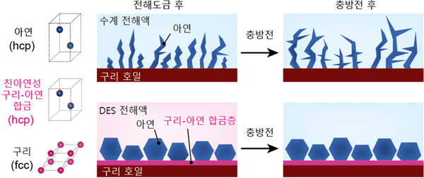 제조한 DES 용액은 콜린클로라이드(Choline chloride, ChCl)와 요소(Urea)를 1:2의 몰비로 혼합해 녹는점이 12℃인 액체 상태의 복합체가 되는 대표적인 DES 물질로 알려져 있다. 연구진은 DES 내에서 아연과 구리 집전체 사이에 친아연성 구리-아연 합금층이 자발적으로 형성하며 고밀도의 아연 입자를 성장시킨다는 사실을 확인했다. 연구진은 이를 활용해 저비용·친환경인 DES용액에서 아연금속을 조밀하고 균일하게 성장시키는 전해도금 공정을 개발하는데 성공했다.