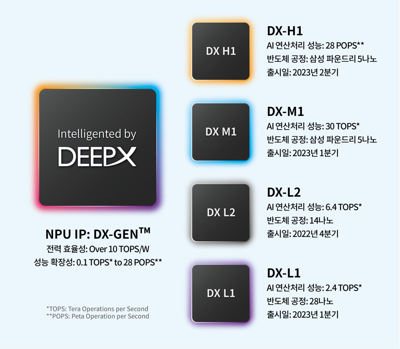 올해 하반기부터 선보이는 딥엑스 시리즈는 응용 분야가 요구하는 AI 연산 성능의 수준과 기능에 따라서 제품군이 DX-L1, DX-L2, DX-M1, DX-H1 총 4가지 솔루션으로 구성되고 삼성 파운드리의 5nm, 14nm, 28nm 공정을 사용해 제작된다. 이 솔루션은 딥러닝 기반 객체 인식, 얼굴 인식, 음성 인식, 이미지 분류, 화질 개선 등의 인공지능 알고리즘 연산 처리를 지원한다. 초소형 센서 기기를 위한 0.1 TOPS(TOPS는 초당 조 횟수의 AI 산술연산 처리 단위)에서 인공지능 서버를 위한 30 POPS(POPS는 초당 경 횟수의 AI 산술 연산처리 단위)까지 범위를 확장할 수 있다.