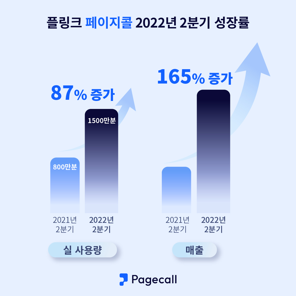 페이지콜의 올해 2분기 실 사용량 또한 1500만 분을 기록하며 전년 동기 대비 87% 증가했다. 또 올해 2분기의 매출과 실 사용량을 직전 분기와 비교한 결과 각각 126%, 12% 증가했다. 플링크는 페이지콜이 설탭, 콴다과외, 풀리수학, 수파자, 개념원리 등 주요 온라인 과외 업체들이 사용하는 서비스임을 감안했을 때, 엔데믹 전환에도 온라인 학습에 대한 수요가 증가한 것으로 판단하고 있다. 2020년 10월 페이지콜 2.0 업데이트 이후, 각 온라인 과외 업체에서 열린 누적 강의실의 총합은 현재 100만개를 돌파했다.