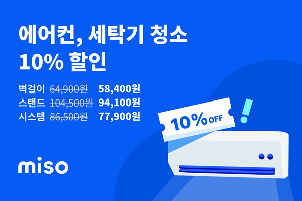 이에 따라 미소는 가정 내 건강 관리 지원의 일환으로 여름철 위생 개선을 독려하고, 늘어나는 가전 청소 서비스 수요에 부응하기 위해 주요 부문에서 이번 할인 프로모션을 마련했다.