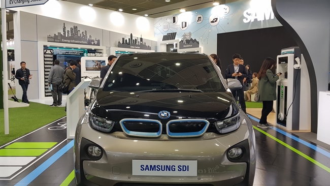 삼성SDI는 자사의 전기차용 배터리가 탑재된 BMW i3 모델을 전시했다. i3에 탑재된 배터리 팩은 33kWh로 1회 충전에 300km를 주행할 수 있다. BMW 외에도 전기자전거용 배터리 솔루션도 함께 소개해 관람객들의 시선을 끌었다.