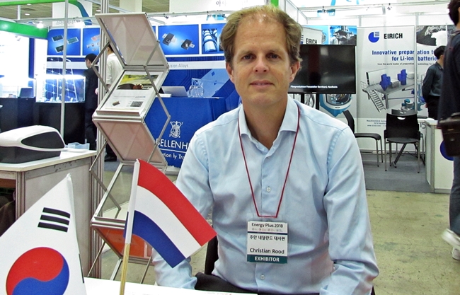 주한 네덜란드 대사관 부스에서는 완전 새로운 방식의 배터리 음극 공정을 개발해 주목받고 있는 ‘레이덴 잘(Leyden Jar)’의 크리스티안 루드(Christian Rood) 상무(Managing Director)를 이주원 선임 상무관의 소개로 만날 수 있었다.