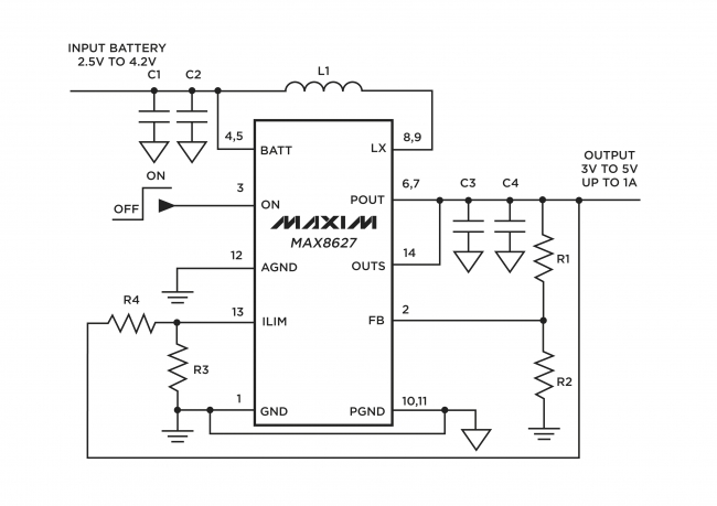 스텝다운 변환은 스텝업이나 부스트 변환 방법보다 더 효율적인 경향을 나타낸다. 그러나 많은 설계 솔루션은 배터리 전압에 의해 제한돼, 애플리케이션의 전압 요구 사항을 수용하려면 -디스플레이는 보통 더 높은 전압을 요구하는데- 종종 스텝업 방법이 필요하다. 스텝업 컨버터의 예로는 맥심(Maxim)의 MAX8627이 있으며, 이 1A 출력은 단일 셀 리튬이온 배터리에서 최대 95% 효율로 3~5V의 부스트된 출력 전압을 생성하고 20μA Iq만을 소비한다[그림 2].