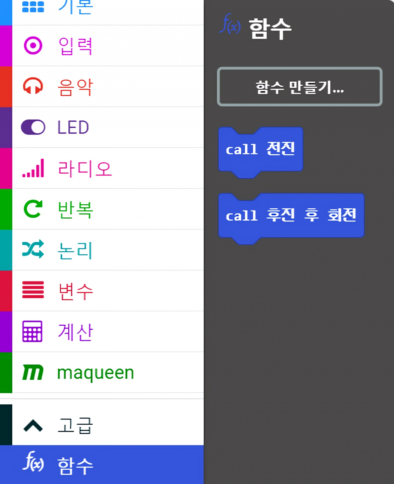 함수 [전진] 블록은 마퀸 RC카가 전진할 때 필요한 블록 코딩만 담겨있으며, 함수 [후진 후 전진]은 RC카가 후진 후 전진하는 기능이 담긴 블록 코딩만 담겨있다. 이런 기능이 담긴 함수들을 필요할 때만 Call 블록을 이용해 불러주면 해당 함수 내부에 있는 블록을 간편하게 실행할 수 있는 것이 함수의 장점이다. 이 기능을 통해 반복되는 동작을 한 번 더 작성하지 않아도 되고, 다른 사람이 코드를 볼 때 이 함수가 어떤 기능을 하는 함수인지 쉽게 알아볼 수 있다.