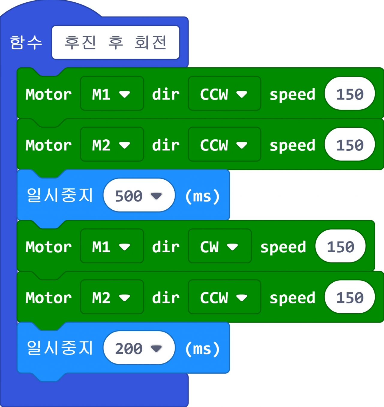 같은 방법으로 함수 [후진 후 회전]을 하나 더 만들어 [Motor [M1] dir [CW] speed (150)]을 4개 가져온 뒤, [기본] 꾸러미에서 [일시 중지 1000(ms)] 블록을 2개 가져와 [그림9]처럼 값을 변경해준다.