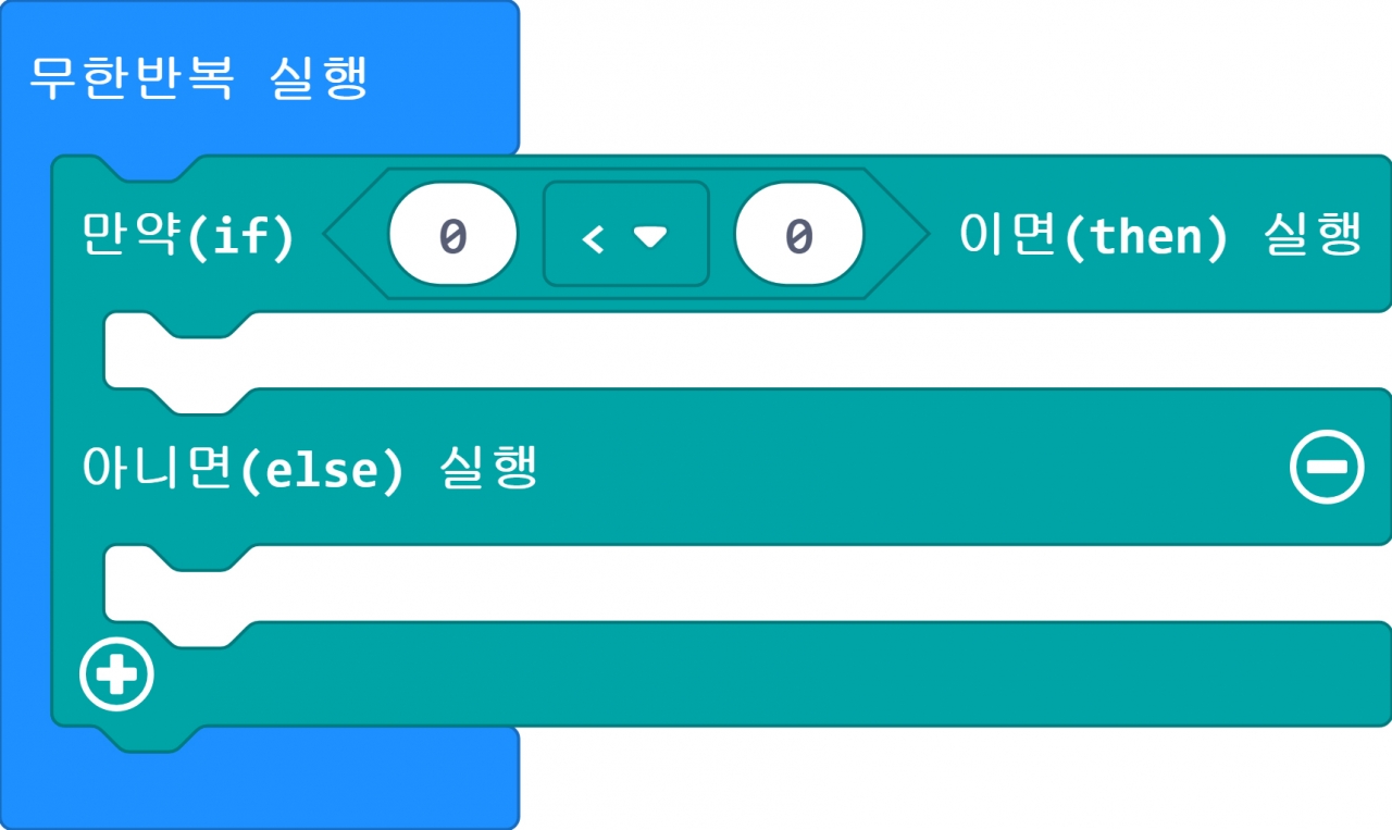 이제 본격적으로 만든 함수들을 활용할 차례다. [기본]꾸러미에서 [무한반복 실행] 블록을 가져온 후, [논리]꾸러미에서 [만약(if) <> 이면(then) 실행, 아니면(else) 실행] 블록을 넣어준 뒤, [논리]꾸러미에서 다시 부등호 블록을 가져와 if 블록에 넣어준다[그림10].