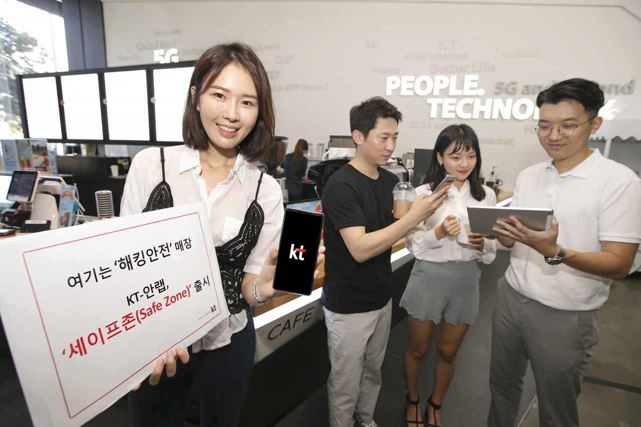 KT는 지난 6월 안랩과 통합 TI(Threat Intelligence, 위협정보) 개발과 신규 보안서비스 출시 업무 협약을 맺고, 그 첫 번째 결과물로 세이프존을 출시했다. 세이프존은 KT 보안 와이파이인 ‘기가 와이파이 시큐어(GiGA WiFi Secure)’를 ‘안랩 V3 모바일 플러스(AhnLab V3 Mobile Plus)’와 연동해 스마트폰·태블릿을 사이버 위협으로부터 보호해주는 서비스다.