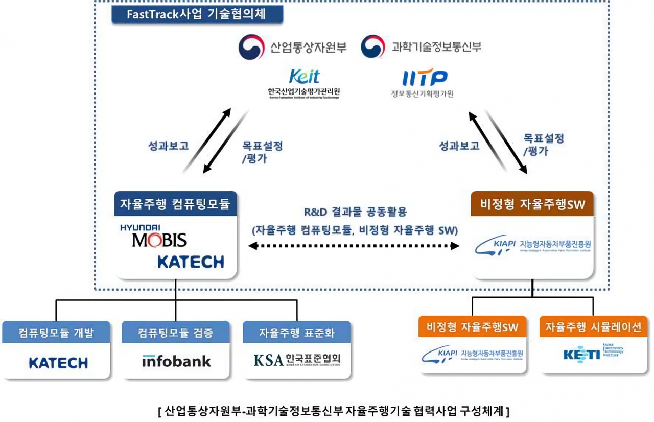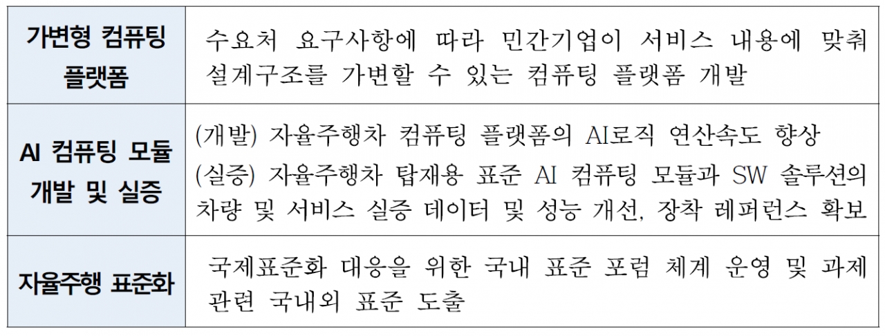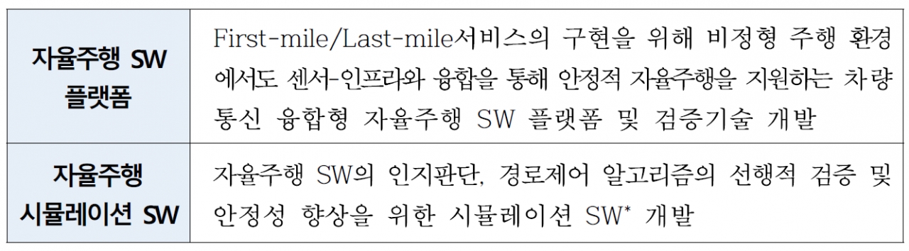 과기정통부는 이번 사업에서 2021년까지 118억 원을 들여 비정형 주행환경에서도 안정적인 주행을 가능하게 하는 소프트웨어와 자율주행기능 검증 시뮬레이션 소프트웨어를 개발할 예정이며, 산업부는 자율주행차의 인공지능(AI) 기반 컴퓨팅 기술과 차량제어 솔루션 개발, 기술 실증, 기타 국내외 표준에 2021년까지 171억 원을 투자할 계획이다. 본 과정은 현대모비스가 주관하고 자동차부품연권과 인포뱅크, 한국표준협회 등 23개 기관이 참여한다.