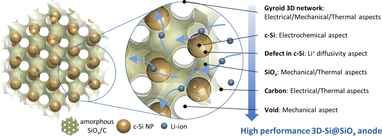 연구팀은 실리콘 팽창에 따른 재료 내부의 저항력(응력)을 최소화하도록 다공성 삼차원 나노 구조체인 자이로이드의 실리콘복합산화물 음극소재를 설계하고 단일공정(one-pot)을 통해 합성하는 데 성공했다.