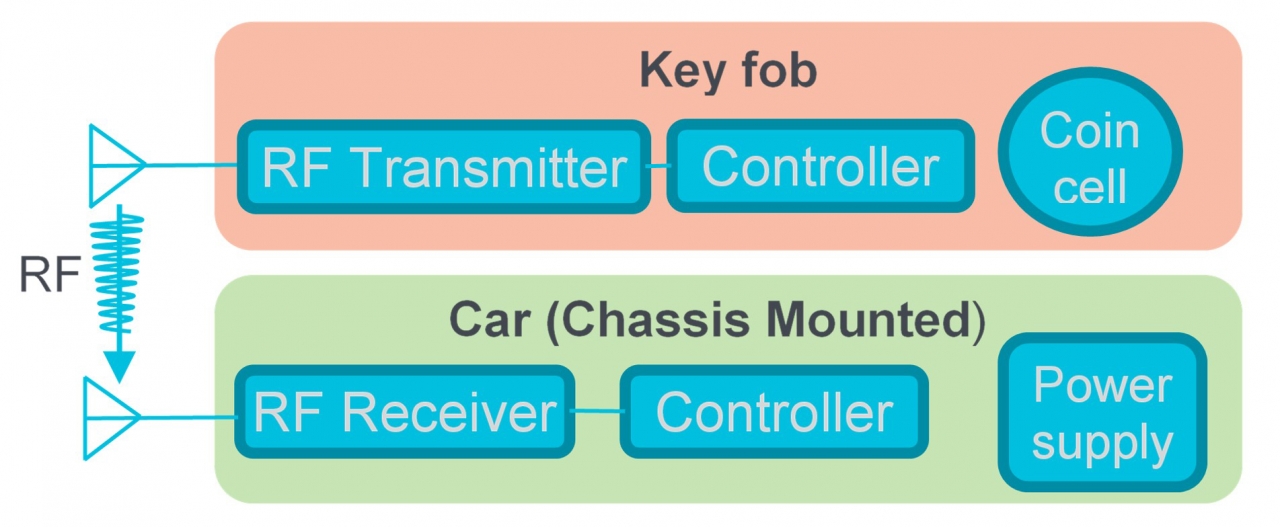 오토모티브 RF 시스템은 기존에 없던 새로운 개념이 아니다. 상당 부분이 기존의 아키텍처와 컴포넌트를 사용하면서, 오토모티브 애플리케이션에 최적화됐을 뿐이다. 기존 기계식 자동차 키를 대체하는 스마트 키 시스템을 예로 살펴보자. RF 기술은 차에서 조금 떨어진 거리에서 차 문을 잠그거나 잠금을 해제할 수 있는 RKE(Remote Keyless Entry) 기능으로 개발됐다. 이를 통해 잠금을 풀기 위해 차에 가까이 가거나, 열쇠를 돌리는 번거로움이 해소됐다. 이처럼 우리는 키 포브에 RF 트랜스미터가 사용되는 RKE에 익숙하다. 또한, 최근 인기가 높아지는 RS(Remote Starting) 기능은 운전자가 엔진을 원격으로 시동·정지시킬 수 있도록 적용한 것으로, 이런 RS 시스템과 기존 RKE 시스템의 논리는 비슷하다. 키 포브의 버튼을 누르면 키 포브 내의 컨트롤러나 CPU가 기동해 신호를 RF 트랜스미터로 보낸다. 자동차의 리시버가 신호를 포착해 복조하고, 적절한 명령을 컨트롤러로 보내 문을 열거나 자동차에 시동을 건다[그림 1]. 이 논리는 차고 문 개폐기(GDO, Garage Door Opener)와 같은 유사 애플리케이션에도 적용할 수 있다.
