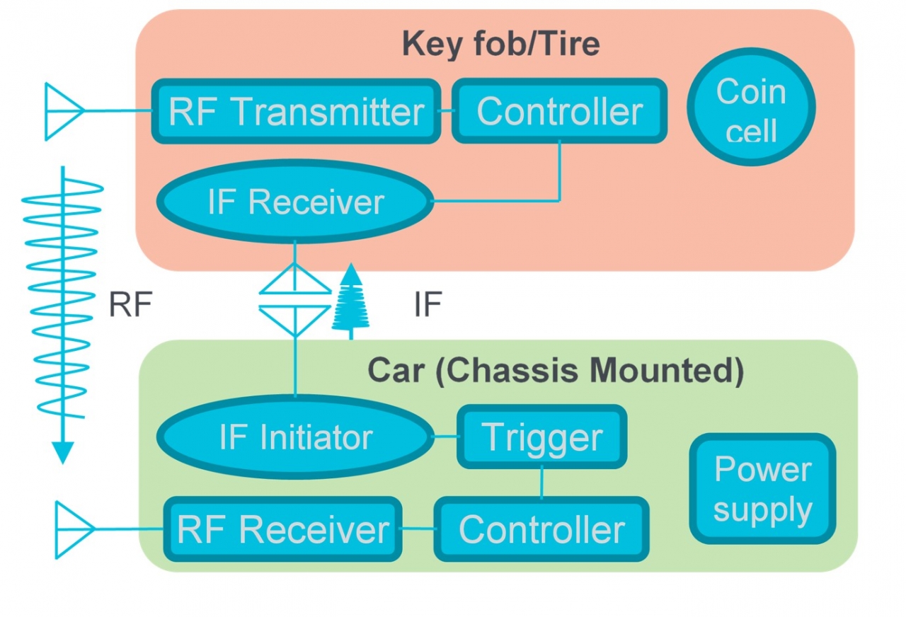 이제 직접적인 키 포브 입력 없이도 문을 잠그고 열며, 엔진의 시동·정지를 수행하는 PKE(Passive Keyless Entry)와 수동 시동(PS, Passive Starting) 시스템에 대해 살펴보자. 이 시스템은 타이어의 공기가 충분하지 않을 때 운전자에게 경고하는 TPMS와 비슷하다. [그림 2]를 보면 PKE, PS 시스템과 TPMS는 RKE, RS 시스템과 비교해 트리거, IF 이니시에이터, IF 리시버가 시스템에 추가됨을 알 수 있다.