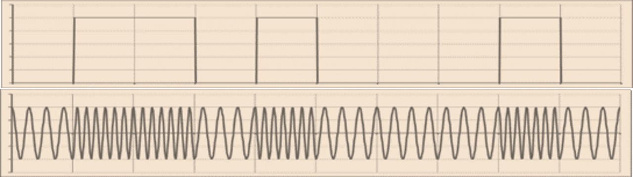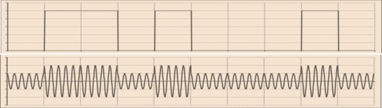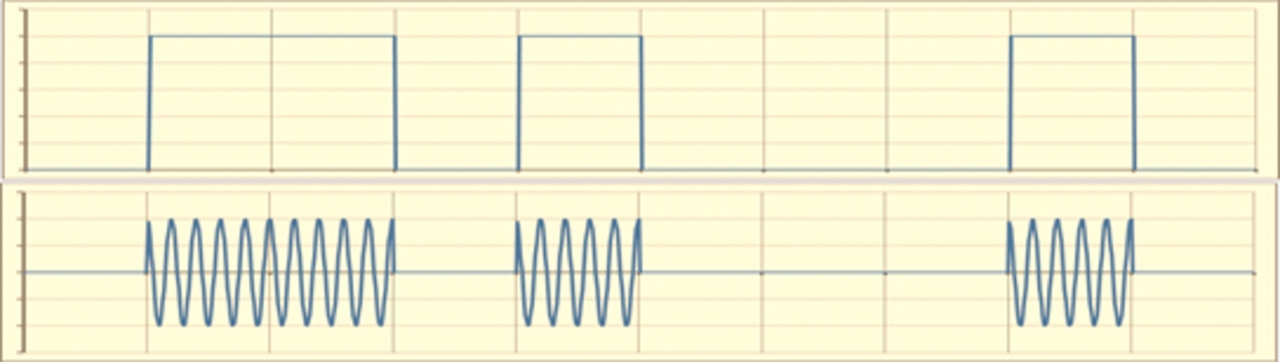 RF 시스템 중 LF 자동차 연결 RF 애플리케이션에서 널리 사용되는 변조 방식은 ASK다. 소스에서 1을 보내려면 큰 진폭 캐리어(Carrier)를 전송하고 가장 단순한 형태로 '를 보내려면 작은 진폭 캐리어를 전송한다[그림 3]. 온-오프 변조(OOK, On-off Keying)는 ASK의 간소화된 특수 버전으로, 소스에서 0을 보내려고 할 때 캐리어를 전송하지 않는다. OOK는 0을 보낼 때 송신 전력을 절감하기 때문에 배터리 작동식 디바이스에서 널리 사용된다[그림 4].