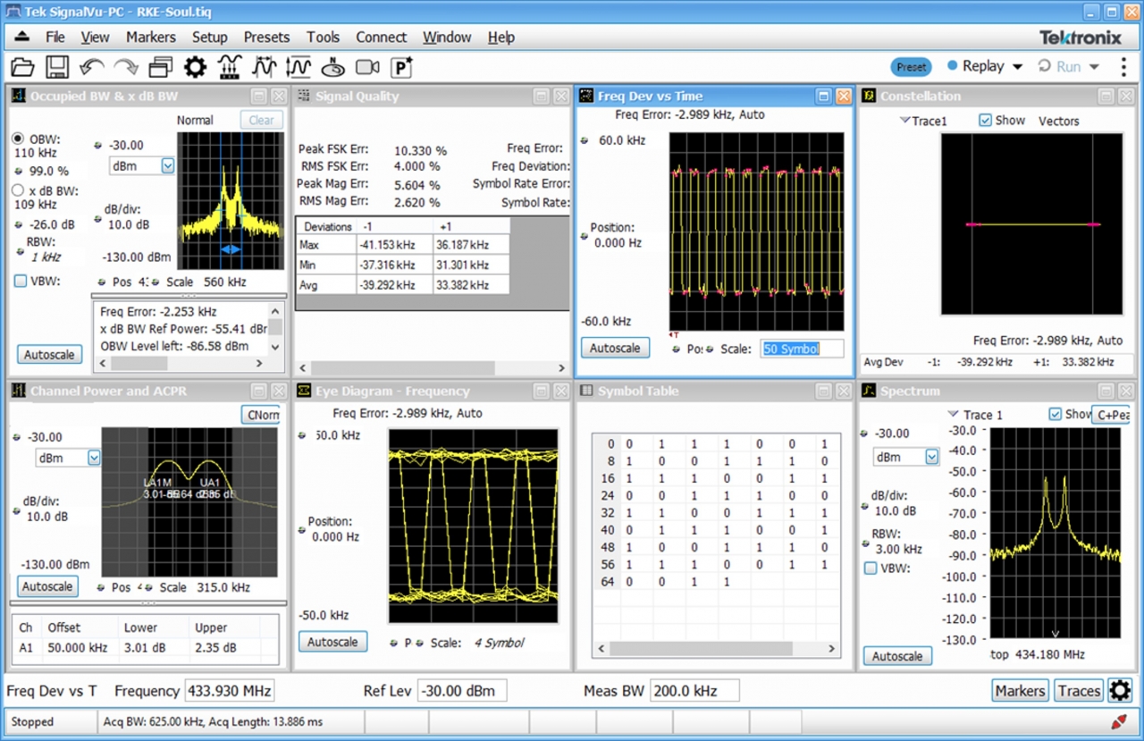 SignalVu-PC는 텍트로닉스의 실시간 USB 스펙트럼 분석기인 ‘RSA300/500/600’ 시리즈에서 사용되는 RF·벡터 신호 분석 소프트웨어다. 범용 디지털 변조 분석에서는 23개 변조 방식을 통한 분석을 제공한다. [그림 6]은 RSA306B 스펙트럼 분석기를 사용해 무선 키 포브에서 트랜스미터 테스트를 수행하는 SignalVu-PC 소프트웨어를 보여준다. DUT(Device Under Test)가 FSK 변조 신호를 433MHz 대역에서 전송하면 SignalVu-PC는 점유 대역폭, 신호 품질 요약, 주파수 편이, 컨스털레이션(Constellation) 다이어그램, 채널 출력과 ACPR, 아이 다이어그램, 복조 신호 테이블, 스펙트럼 분석을 포함한 6개의 각기 다른 테스트 결과 세트를 제공한다. 필요에 따라 더 많은 테스트를 수행할 수도 있다.
