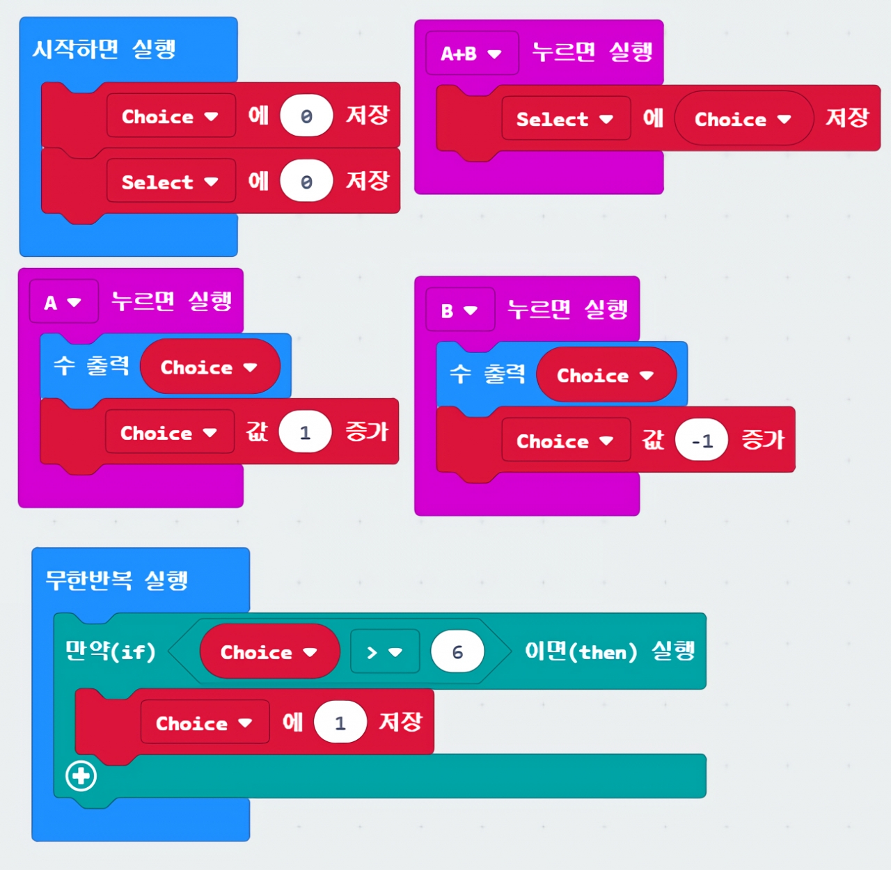 다음으로 A 버튼과 B 버튼을 같이 누르면 해당 숫자를 Select 변수에 저장해 선택하게 만들 것이다. 마이크로비트는 6가지 센서 모듈이 있으므로 1부터 6까지의 숫자만 사용하기 위해 Choice가 6을 넘길 경우 다시 1로 만들어주는 코딩도 더해준다.