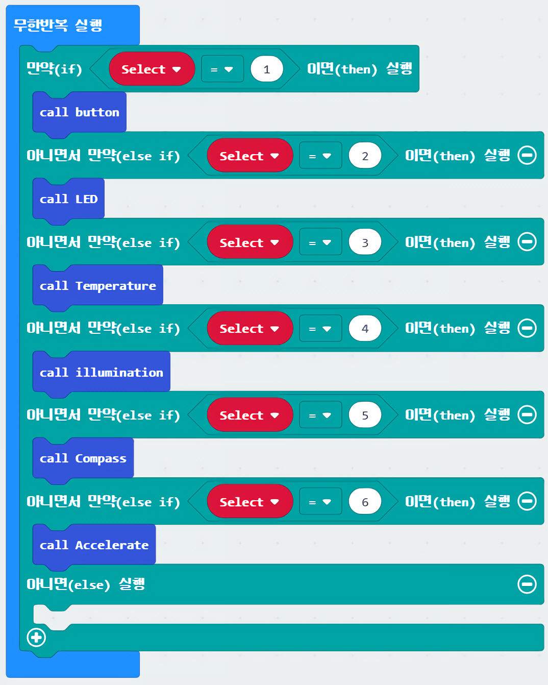 그다음 선택한 Select 버튼에 따라 각각의 센서/모듈의 동작을 확인하기 위한 함수 6가지를 만들 것이다. Select의 1에서 6까지 숫자를 아래 조건문을 이용해 실행시킬 트리거를 만들어 준다[그림2]. 이러면 각 숫자별로 버튼, LED, 온도 센서, 조도 센서, 나침반 센서, 가속도 센서를 동작시킬 수 있다.